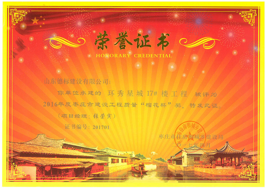 2016年度棗莊市建設(shè)工程質(zhì)量榴花杯獎(jiǎng)-環(huán)秀星城17#樓